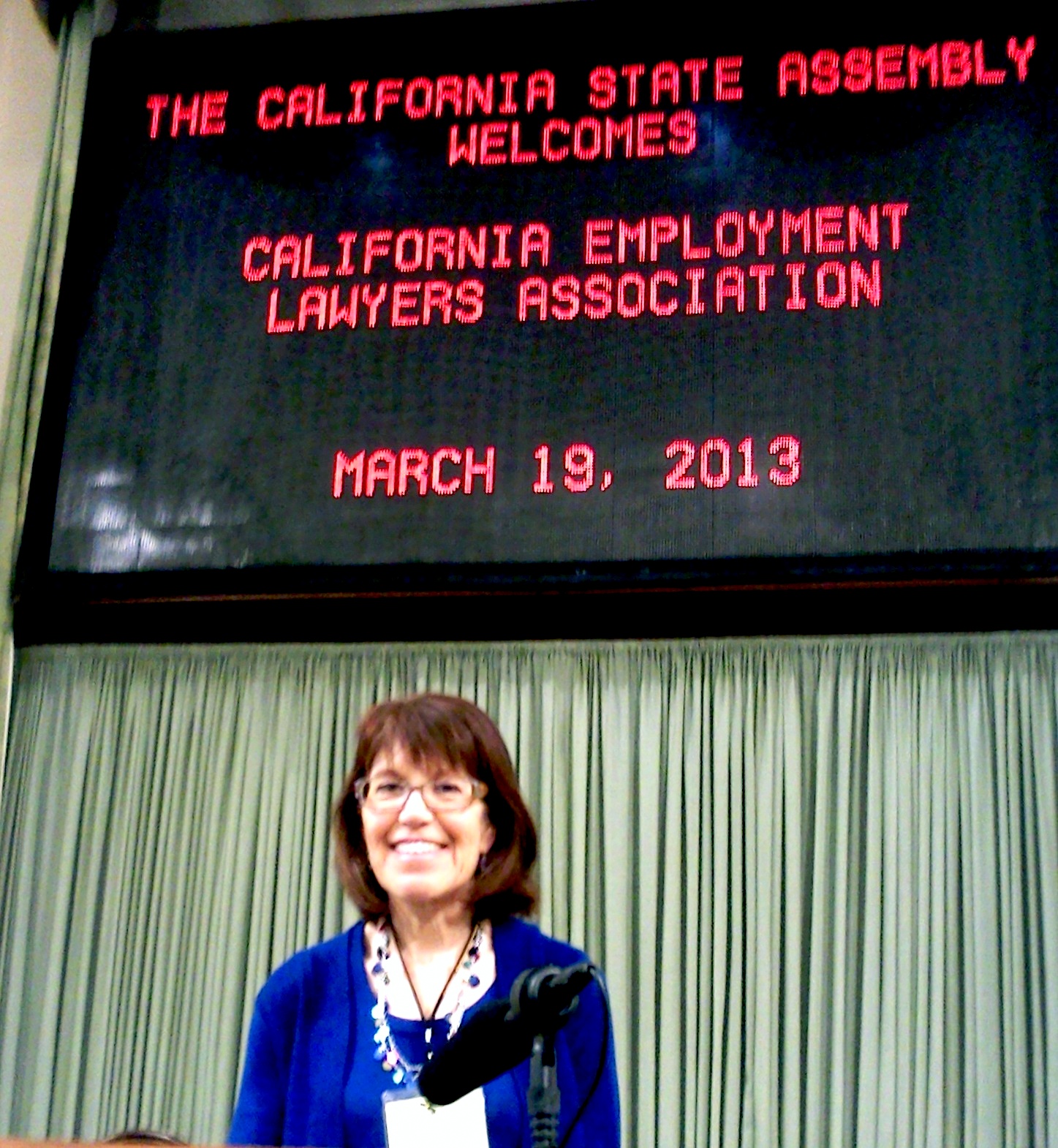 ImageTuesday, March 19th, 2013:  I experienced democracy in action by joining the California Employment Lawyers Association (CELA) Lobby Day at our state Capitol in Sacramento.   (Yes, that’s me in the photo at the state Capitol.) CELA attorneys represent millions of California employees who want to work, free of unlawful discrimination and be paid their earned wages.   Each Spring CELA attorneys from all over California give up a day of work to meet with our state legislators and urge them to support bills to help improve California workplaces for employees and employers.